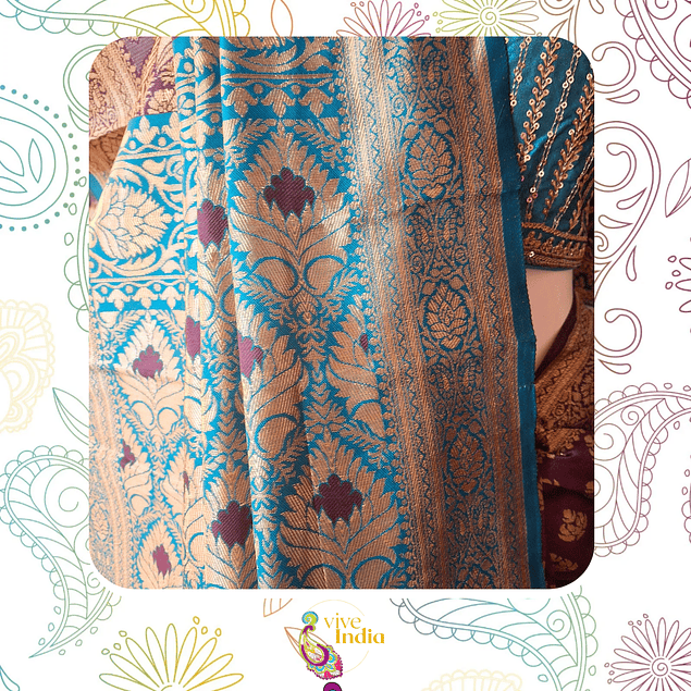 Sari diseño Baranasi, tela bordada entera en seda suave, diseño de plumas de pavo real en el velo.
